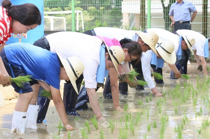 최근 서울 금천구가 서울시 농업기술센터에서 주최한 '2014 도시농업 최고 텃밭상' 시상식에서 ▲아이디어 텃밭 최우수상 ▲베란다 텃밭 최우수상 ▲주말농장 장려상 ▲옥상 텃밭 장려상 ▲자투리 텃밭 장려상을 수상했다. 사진은 아이디어 텃밭 분야에서 최우수상을 받은 영남초등학교 테니스장 텃밭에서 모내기 중인 관계자들의 모습.(사진제공=금천구청)