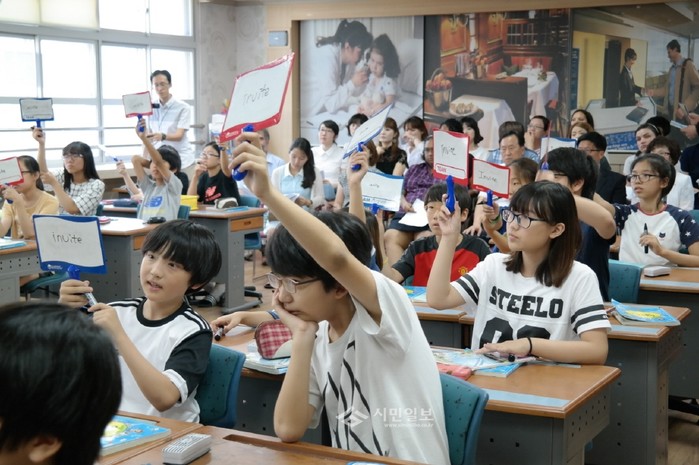 충남 아산교육지원청은 최근 탕정초등학교 영어체험실에서 6학년 학생들을 대상으로 한국인 교사와 원어민 영어 보조교사 협력수업의 일환으로 '원어민 영어 보조교사 공개수업'을 실시했다. 사진은 이날 공개수업에 참가한 학생들이 적극적으로 참여하고 있는 모습. (사진제공=아산교육지원청)