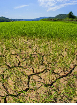 연일 30도를 넘나드는 더위와 극심한 여름 가뭄으로 인해 경북 안동시 도산면 토계리의 한 논이 거북이 등 처럼 쩍쩍 갈라져 있다.
