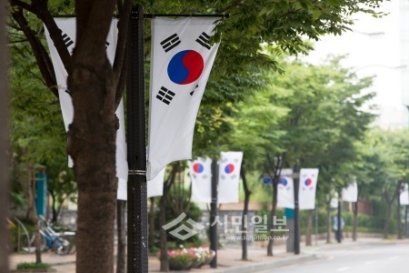 서울 성동구는 지난 6월부터 유동인구가 많은 고산자로 일부 구간을 태극기 상시 게양거리로 지정하고, 나라 사랑 실천에 앞장서고 있다. 사진은 태국기가 걸려있는 청소년수련관 앞 전경.