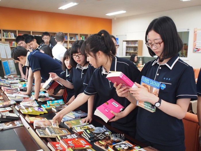 인천교육연수원은 지난 16일 인천공항고등학교와 인천영종고등학교 학생 22명이 참가하는 영종 영어 북클럽 카페 개강식을 열었다. 사진은 북클럽 참여 학생들이 'Summer English Book Cafe'에서 진열된 책을 구경하고 있는 모습. (사진제공=인천광역시교육청)