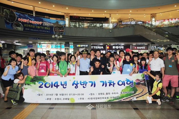 경기 수원시가 지난 16일 장애 청소년의 정서적 안정과 사회 적응력 향상을 위해 지역내 장애 청소년, 보호자 총 350명을 대상으로 장애가족 기차여행을 실시했다. 사진은 출발 전 기념촬영을 하는 참가자들의 모습. (사진제공=수원시청)