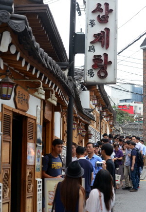 초복을 하루 앞둔 17일 오전 서울 종로구의 한 삼계탕집을 찾은 시민들이 길게 줄을 서고 있다.