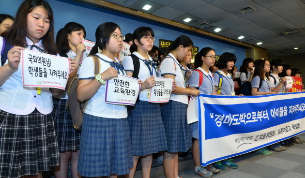 지난달 28일 시범운영으로 개장한 서울 용산 화상경마장 옆의 성심여자중·고등학생들과 새정치민주연합 을지로위원회 소속 의원들이 17일 오후 서울 여의도 국회 정론관에서 마사회의 화상경마장 철회를 위한 국회의원님들께 드리는 호소문을 낭독하고 있다.