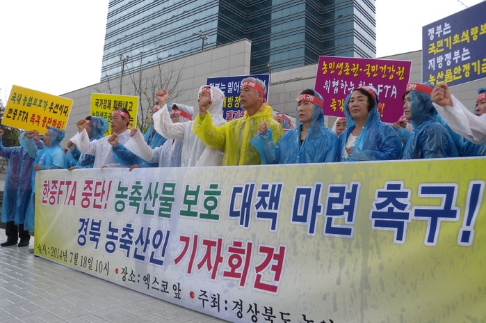 18일 정부가 내년부터 쌀 시장을 전면개방하기로 한 가운데 이날 오전 한중FTA 제12차 협상이 열리고 있는 대구 엑스코 맞은편에서 경북지역 농민단체 회원들이 기자회견을 갖고 정부의 쌀 시장 개방과 한중FTA 협상 중단을 촉구하고 있다.