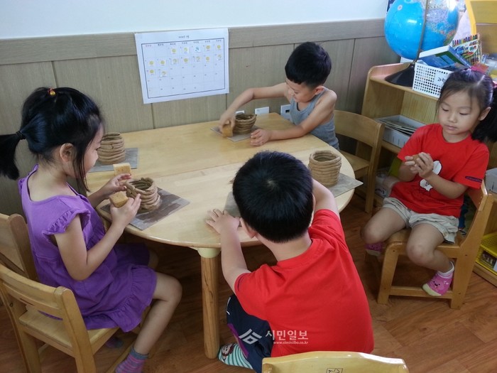 경기 부천시 성곡초등학교 병설유치원은 지난 21일 '토토랑 공방'을 초대해 원생들을 대상으로 도자기 체험활동을 진행했다. 사진은 이날 도자기 체험활동에 참가한 아이들이 전문가의 지도 아래 직접 화분을 만들고 있는 모습. (사진제공=부천교육지원청)
