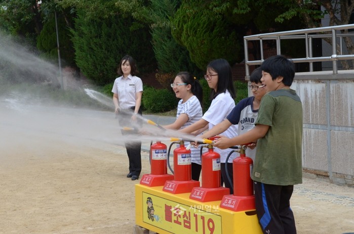 21일 서울 영등포소방서가 당산초등학교에서 학생과 교직원 800여명을 대상으로 화재발생시 대피요령, 안전사고 대처방법과 응급처치방법, 소화기 사용법과 물소화기 실습 등을 포함한 화재안전교육 및 대피훈련을 실시했다. 사진은 화재발생상황에 대비해 물소화기로 소화기 사용방법을 체험 중인 학생들의 모습. (사진제공=영등포소방서)