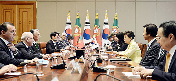 박근혜 대통령이 21일 오전 청와대에서 공식 방문한 아니발 안토니우 카바코 실바(Anibal Antonio Cavaco Silva) 포르투갈 대통령과 정상회담을 하고 있다.