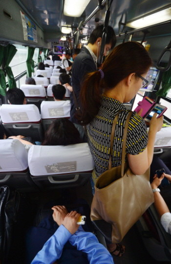 수도권 직행좌석버스 입석 금지 제도가 시행된지 6일째인 21일 오전 서울행 경부고속도로를 달리는 용인-서울 광역버스에서 시민들이 입석으로 탑승해 있다.