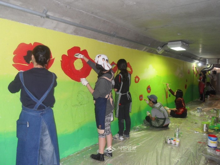 | ▲ 2012년 죽전1동주민자치위원회와 관계자들이 탄천지류인 안대지천 대지교 교각에 벽화를 그리는 모습.(사진제공=용인시청) | ||
