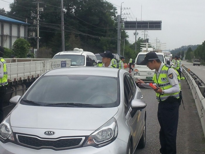 유병언(73) 전 세모그룹 회장의 시신이 순천에서 발견됐다는 소식이 전해진 22일 오전 안성시 보개면 상삼리 기독교복음침례회 금수원 주변 국도에서 경찰이 차량 탑승자에 대한 검문검색을 실시하고 있다.