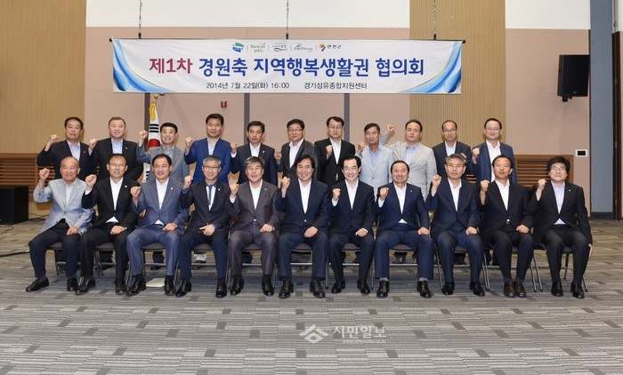 지난 22일 경기 양주시는 경기섬유종합지원센터 컨벤션홀에서 의정부시·포천시·동두천시·연천군의 지자체장들과 시의원·관계 공무원·민간위원 등 23명이 참석한 가운데 '제1차 경원축 생활권협의회'를 개최했다. 사진은 기념촬영 중인 협의회 관계자들의 모습. (사진제공=양주시청)