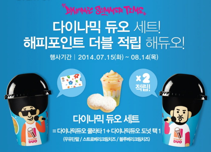 다이나믹 썸머 캠페인의 일환으로 해피포인트 더블적립 이벤트도 실시된다. 이 이벤트는 다이나믹듀오 쿨라타와 다이나믹듀오 도넛 1개로 구성된 다이나믹듀어 세트를 구매할 경우 해피포인트를 기존의 두배인 10% 적립해주는 이벤트다. 이벤트 기간은 오는 8월14일까지다. 이 이벤트는 다이나믹듀오 세트만 적용 가능하며, 행사 참여 시 해피포인트 사용이 불가하다. 또 타행사, 타쿠폰, 제휴할인 중복이 불가하고 모바일쿠폰도 사용할 수 없다.
