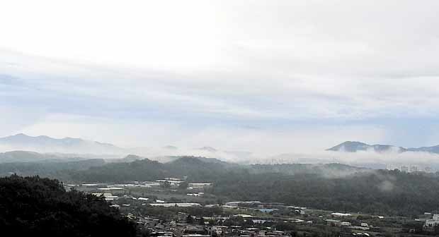 장맛비가 잠시 소강상태를 보인 24일 오전 경기 고양시 한 아파트에서 바라본 북한산 등 마을 뒤 주변 산들에 안개가 끼어 수채화 같은 풍경을 만들고 있다.