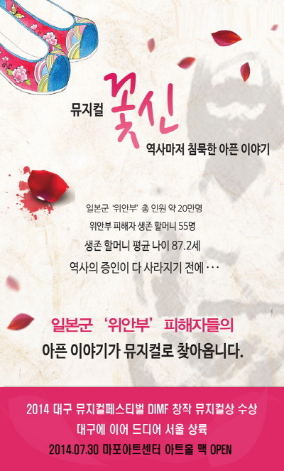 역사마저 침묵한 아픈 이야기를 애절한 음악과 탄탄한 스토리로 녹여내 화제를 모으고 있는 뮤지컬 <꽃신>은 오는 30일~오는 8월17일 마포아트센터 아트홀 맥에서 공연된다.