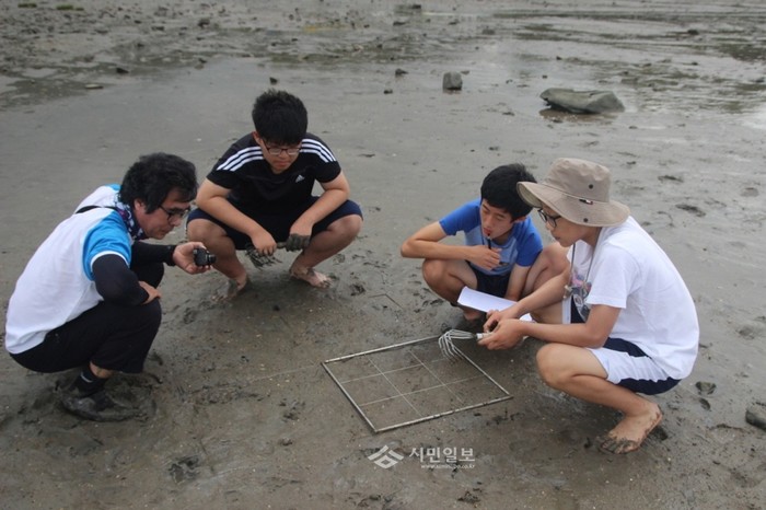 지난 25일 인천 학생교육원 해양환경체험학습장에서 강화지역 중학교 2·3학년 영재학생 40여명이 참여해 갯벌 생태에 대한 이해를 높이고 갯벌 생물의 분포와 종류에 대한 연구하기 위한 목적으로 갯벌 체험이 진행됐다. 사진은 선생님과 함께 갯벌체험 중인 참여 학생들의 모습.(사진제공=인천광역시교육청)