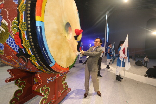| ▲이순우 우리은행장이 지난 26일 일산 킨텍스에서 열린 '우리은행 2014 하반기 경영전략회의'에서 성공적인 민영화를 완수하기 위해 임직원 모두가 동심동력(同心同力)의 자세로 위풍당당하게 나아가자는 의미에서 진군의 북을 울리고 있는 모습. | ||