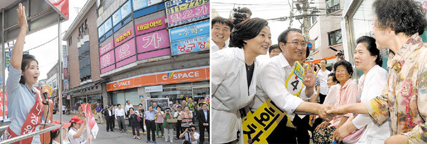 7.30재보궐선거를 하루 앞둔 29일 오후 동작을 나경원 새누리당 후보가 서울 동작구 흑석동 빗물펌프장 앞에서 시민들에게 지지를 호소하고 있다. 같은 날 동작을 노회찬 정의당 후보는 박영선 새정치민주연합 원내대표와 함께 동작구 사당시장을 돌며 시민들에게 지지를 호소하고 있다.