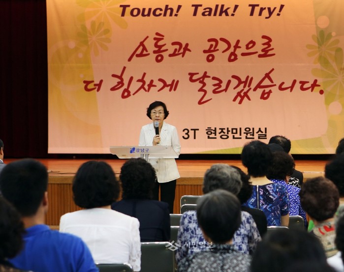지난 29일 신연희 서울 강남구청장이 강남구 세곡문화센터에서 세곡동 주민의 의견을 듣기 위해 개최된 '현장민원실'에서 인사말을 하고 있다. 이날 신 구청장은 “주민의 고귀한 의견을 하나도 놓치지 않고 해결할 수 있도록 고민할 것이며 앞으로도 더 좋은 강남구를 만들기 위해 주민과 함께 고민하고 소통할 것”이라고 말했다. (사진제공=강남구청)