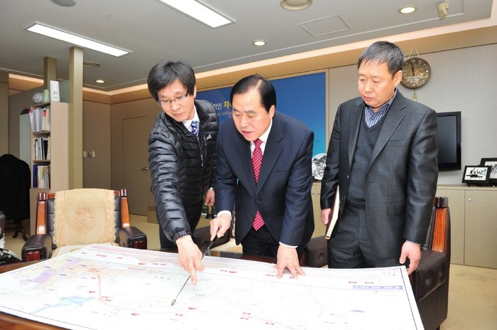 | ▲ 현삼식 양주시장이 국지도 39호선의 설계도면을 보며 관계자들과 논의하고 있는 모습. 국지도 39호선은 서울~양주~동두천~연천 간 산업단지들을 연결한다. | ||