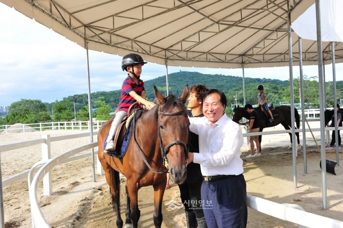 | ▲ 현삼식 양주시장이 승마장을 방문한 학생의 승마를 돕고 있는 모습. 시는 생태승마장도 조성할 예정이다. | ||