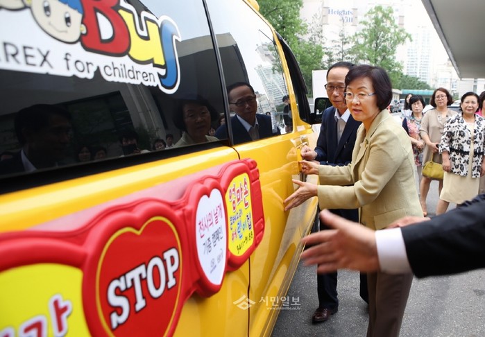 신연희 서울 강남구청장이 지난 7월31일 구청 어린이집 앞에서 현대자동차로부터 ‘승하차보호기’를 전달받고 어린이집 통학차량에 이를 설치한 후, 출입문을 열고 있다. 어린이 승하차보호기는 현대자동차에서 무상 지원받아 지역내 통학차량을 운영 중인 34개 어린이집 차량에 설치 예정이다. (사진제공=강남구청)