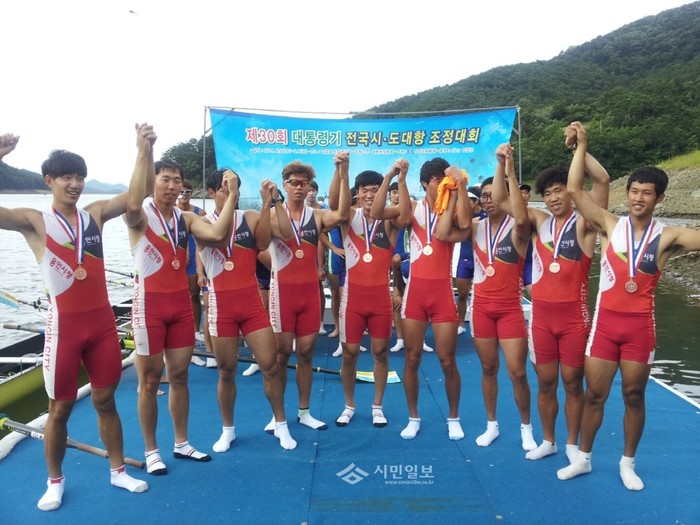 지난 7월30일부터 이틀간 전남 장성군 장성호 조정경기장에서 열린 '제30회 대통령기 시도대항 조정대회'에 출전한 용인시청 조정팀이 싱글스컬, 경량급 싱글스컬, 더블스컬, 무타페어에서 금메달을 따 5개 종목 출전, 4개 종목 우승의 성과를 냈다. 사진은 대회를 마친 용인시청 조정팀 선수들의 모습. (사진제공=용인시청)