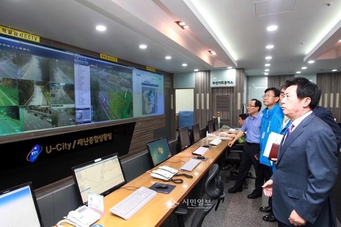 | ▲ 안전분야 사업을 범시민적 자원봉사 운동으로 전개한다는 방침을 내세우고 있는 정찬민 경기 용인시장이 용인 CCTV관제센터 시설을 둘러보고 있다.(사진제공=용인시청) | ||