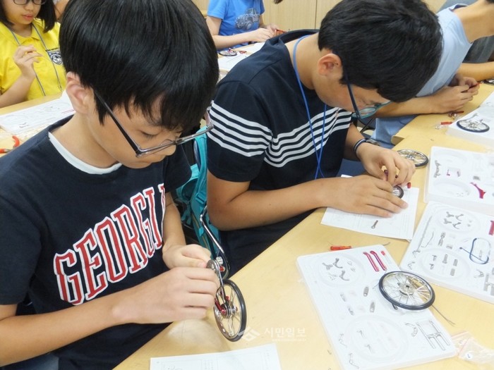 인천 부평도서관에서는 여름방학을 맞이해 인천지역 24개교 중학생을 대상으로 학생들의 탐구력과 창의력을 높이기 위해 최근 '2014년 제23회 여름발명특허교실'을 운영했다. 사진은 참가한 학생들이 '자전거 만들기 실습'의 일환으로 자전거를 조립하고 있는 모습. (사진제공=인천시교육청)