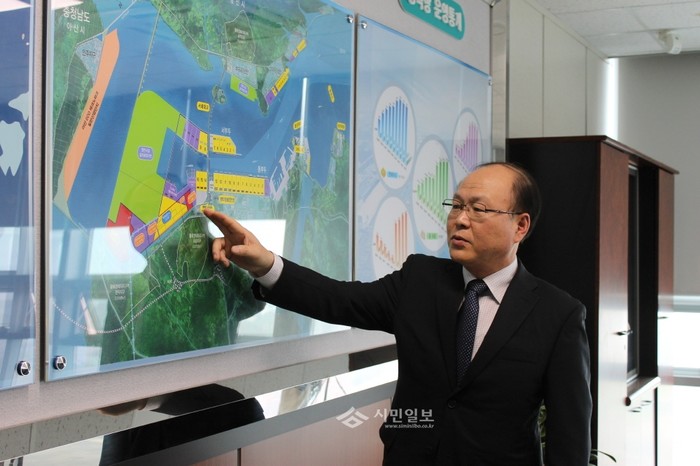 | ▲ 경기평택항만공사 정승봉 사장이 <시민일보>와의 인터뷰에서 지도를 보며 앞으로의 발전계획을 설명하고 있다. | ||