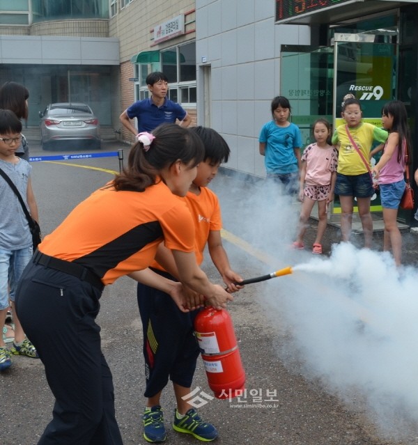 지난 4일 드림스타트사업에 선정된 초등학생 30여명이 인천 남동소방서에서 어린이들의 화재예방·위험대처 능력 향상을 위해 실시한 '소방안전교육'에 참여했다. 사진은 소방관의 지도 아래 연기 소화기를 사용하고 있는 모습. (사진제공=남동소방서)