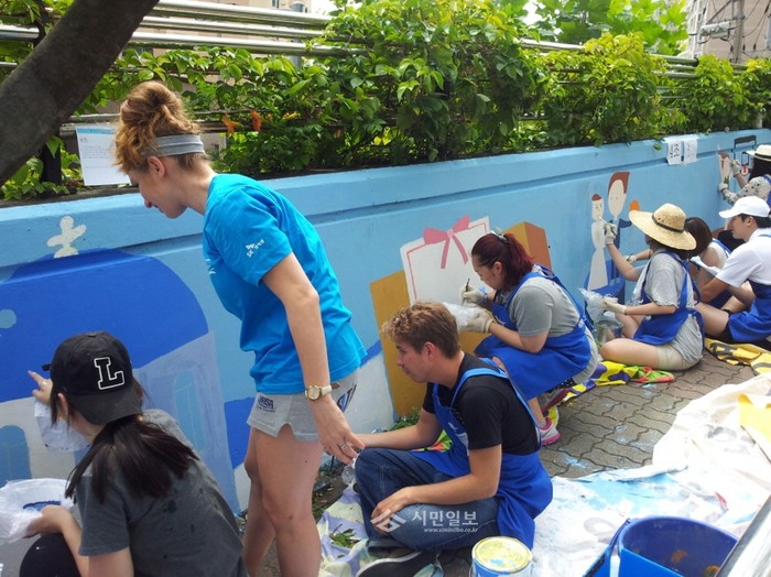 삼성썬더스농구단 선수들이 용산구자원봉사센터, 지역 봉사자들과 함께 용산구 원효로2동 앞의 낡고 허름한 도로담장에 밝고 산뜻한 색채의 그림을 그려 화사하게 꾸미는 '벽화그리기 봉사활동'을 펼치고 있다. (사진제공=용산구청)