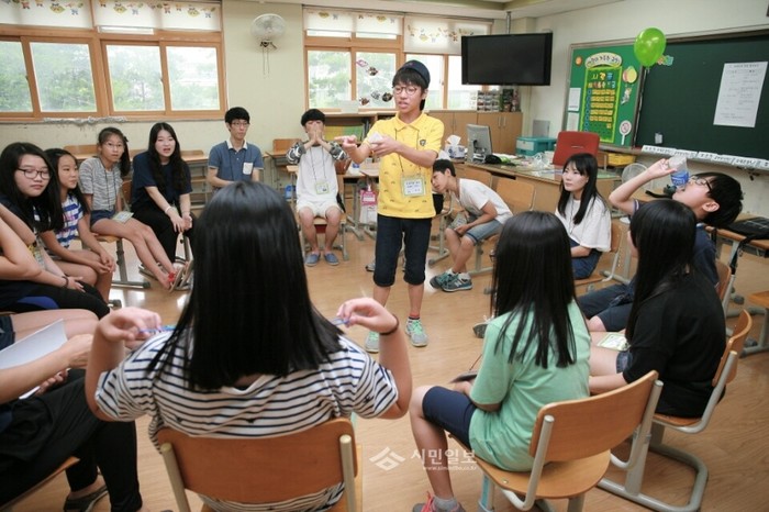 경기 부천교육지원청은 지난 4일부터 중동초등학교 체육관에서 지역내 초·중·고등학교 또래조정인 500여명과 지도교사 120여명을 대상으로 ‘2014 부천 소나기 동호동락(同好同樂) 여름캠프’를 개최했다. 캠프는 1기와 2기로 나뉘어 4일간의 일정으로 진행된다. 사진은 분임별 활동을 하고 있는 참가 학생들의 모습. (사진제공=부천교육지원청)