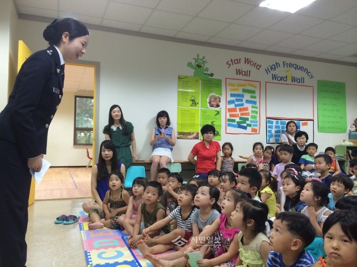 경기 하남경찰서 전진욱 여성보호계장이 5일 하남시 KDLP어린이집을 방문해 강당에서 어린이 100여명을 대상으로 '어린이 성폭력 예방'을 주제로 교육을 하고 있다. (사진제공=하남경찰서)