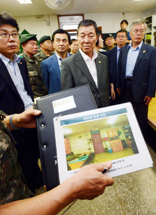 국회 국방위원회 황진하 위원장을 비롯한 여야 의원들이 윤모 일병 집단구타 사망사건 현장조사를 위해 5일 경기도 연천 28사단 977포병대대 의무 내무반을 방문, 부대 지휘관으로부터 현장설명을 듣고 있다.