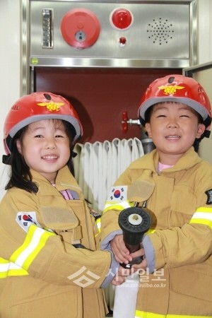 6일 서울 구로소방서 3층 소방안전체험교실에서 열린 '나는야 용감한 소방대장' 체험학습 프로그램에 참가한 광명시 철산동 '광명시청직장어린이집' 원생들이 소방장비를 착용한 채 소방호수를 들고 있다. (사진제공=구로소방서)