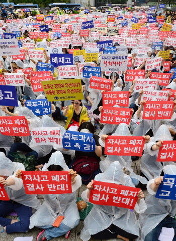 자사고학부모연합 관계자들이 6일 오후 서울 종로구 보신각 앞에서 열린 '자사고 폐지 반대 집회'에서 구호를 외치고 있다.