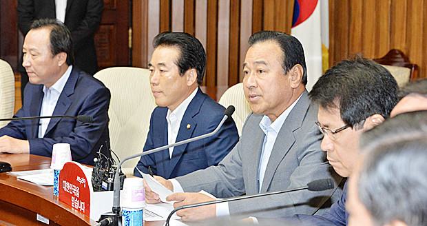 2일 오전 서울 여의도 국회 본관 245호 회의실에서 열린 새누리당 원내대책회의에서 이완구 원내대표가 세월호 특검법 재협상 관련 설명을 하고 있다.