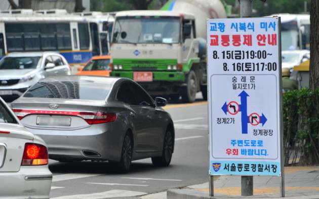 프란치스코 교황의 시복식을 앞두고 서울 광화문광장에 무대설치가 시작된 12일 오후 서울 종로구 종각 주변 도로에 교통 통제 예고 입간판이 설치돼 있다.