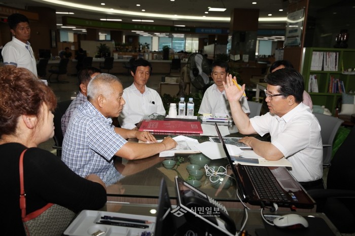 최근 경기 이천시가 청사 종합민원실에서 지역주민과의 소통을 위해 개최한 '시장과 시민 소통의 날' 행사에 조병돈 이천시장이 자리해 지역주민들에게 직접 민원처리에 관한 어려움을 들으며 대화를 나누고 있다. (사진제공=이천시청)