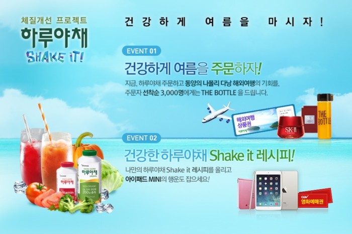 이와 더불어, 하루야채를 활용한 ‘shake it 레시피 콘테스트’도 진행된다. 하루야채를 더 맛있게 즐길 수 있는 레시피와 사진을 올리면 ‘아이패드 미니 레티나’ (1명), ‘LG 포켓포토 포포2’ (5명), ‘CGV 영화예매권’ (50명) 등의 행운이 따른다.