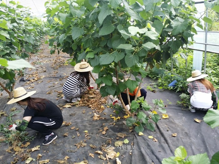 최근 대학생 봉사단체 '로타랙트 3690지구'가 경기 양평군 양동면 계정리를 방문해 부추베기, 가지치기 등의 일손을 돕는 농촌봉사활동을 실시하고 지역 주민들과 다양한 주제로 토론하는 시간을 보냈다. 사진은 비닐하우스에서 농사일을 돕는 대학생들의 모습. (사진제공=양평군청)