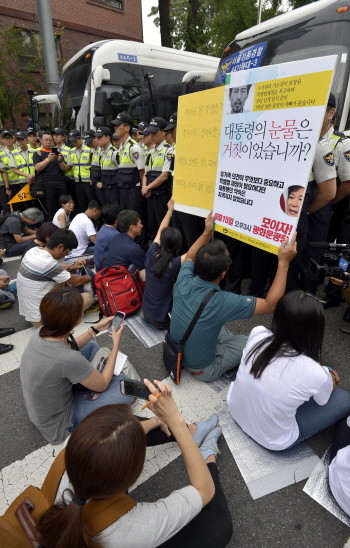 13일 서울 종로구 청운효자동 주민센터 앞에서 '416 광화문 국민농성단'이 세월호 특별법 제정을 촉구하는 기자회견을 마친 후 청와대 앞에서 진입을 막는 경찰들과 대치하고 있다.
