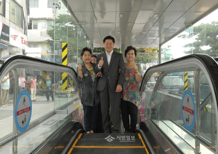 지난 14일 서울지하철 2호선 을지로4가역 9번 출입구의 에스컬레이터 개통식에 참가한 최창식 중구청장이 주민들과 함께 에스컬레이터 시승식을 한 후, 중구를 찾는 관광객들이 편하게 다닐 수 있도록 지속적인 지역내 모든 역의 이동편의시설 설치를 건의하겠다는 방침을 밝혔다.(사진제공=중구청)