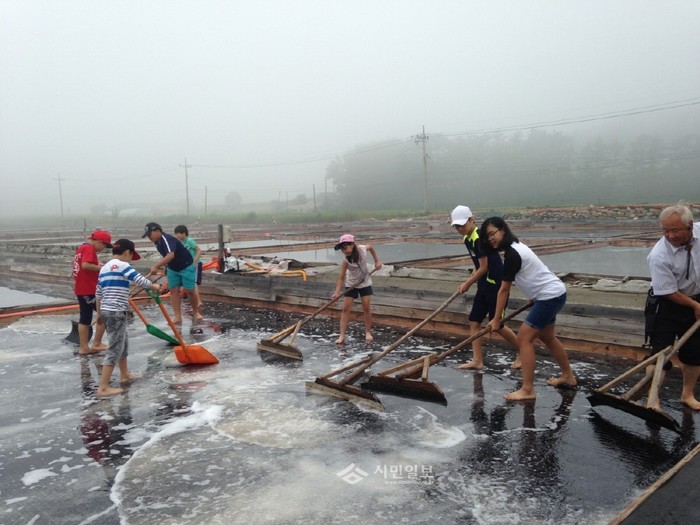 지난 13일 인천 남동구 만수3동 주민자치위원들과 지역내 저소득 청소년 등 30여명이 여름방학을 맞아 교류행사의 일환으로 자매결연지인 충남 태안군 이원면을 방문해 염전갯벌 체험을 하고 있다. (사진제공=남동구청)