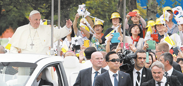 프란치스코 교황이 16일 오후 충북 음성군 꽃동네를 방문, 낙태된 아이들을 기억하는 태아동산으로 이동하고 있다.