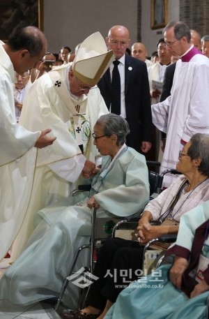 18일 서울 중구 명동성당에서 열린 '평화와 화해를 위한 미사'에 프란치스코 교황이 일본군 위안부 피해자 할머니들을 만나 위로하고 있다.