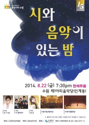 ‘시와 음악이 있는 밤’은 전석 무료로 누구나 관람할 수 있으며 자세한 사항은 수원시 문화관광과 (031-228-2471~3)으로 문의하면 된다.