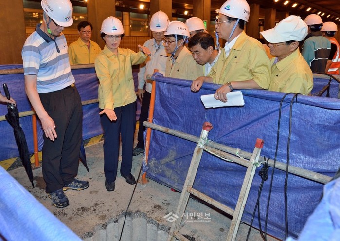 지난 17일 박춘희 송파구청장이 석촌지하차도 싱크홀 현장을 방문해 싱크홀 부분을 보며 관계자들과 논의하고 있다. (사진제공=송파구청)