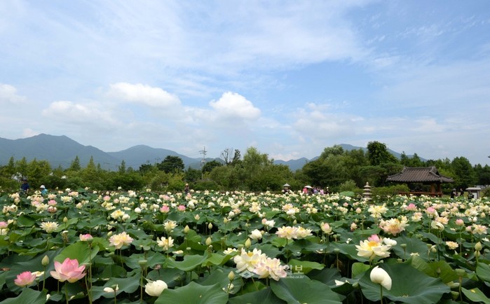 | ▲ 아름다운 연꽃들이 만개한 양평군 세미원 전경. 두물머리와 세미원을 포함한 양수리를 한 번에 둘러볼 수 있는 두물머리 물래길에는 양수리·용담리 일원 용늪에 가득한 연꽃을 보러 온 관광객들이 하루 종일 끊이지 않는다. (사진제공=양평군청) | ||